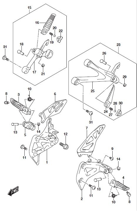 - OPTION1 43511-17K00 BRACKET, FRONT FOOTREST RH, 2 43521-17K00 BRACKET, FRONT FOOTREST LH, 3 43516-37H10 BAR, FOOTREST RH, 4 43526-37H10 BAR, FOOTREST LH, 5 43531-41G20 HOLDER, FOOTREST, 6 43571-17K00 GUARD, FOOTREST RH, 7 43576-17K00 GUARD, FOOTREST LH, 8 43576-48B40 BOLT, BANK SENSOR, 9 43577-35F10 SCREW, FOOTREST GUARD LH, 10 43581-47H00 SPRING, FRONT FOOTREST, 11 09106-08186 BOLT (8X23), 12 09106-10064 BOLT (10X28), 13 09208-08018 PIN, 14 08332-1106A E RING, 15 43600-17K00 FOOTREST ASSY, PILLION RH, 16 43611-37H30 .BAR, PILLION FOOTREST RH, 17 43811-17K00 .BRACKET, PILLION FOOTREST RH, 18 09208-08020 .PIN, 19 09440-05005 .SPRING, 20 06111-07004 .BALL, 21 08332-1106A .E RING, 22 43816-01H20 .PLATE, PILLION FOOTREST, 23 43700-17K00 FOOTREST ASSY, PILLION LH, 24 43621-37H30 .BAR, PILLION FOOTREST LH, 25 43821-17K00 .BRACKET, PILLION FOOTREST LH, 26 09208-08020 .PIN, 27 09440-05005 .SPRING, 28 06111-07004 .BALL, 29 08332-1106A .E RING, 30 43816-01H20 .PLATE, PILLION FOOTREST, 31 09106-08186 BOLT (8X23)