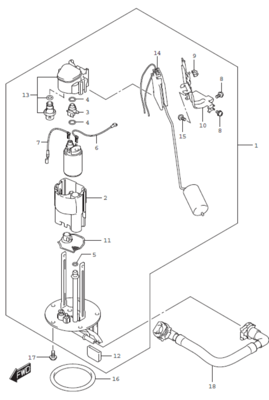 - SELECT ONE1 15100-04K00 PUMP ASSY, FUEL 1, 2 15111-27G00 .CUP, RESERVOIR 1, 3 15112-05H00 .JOINT 1, 4 15113-05H00 .O RING, 5 15113-35F00 .O RING 1, 8 15116-10F00 .SCREW, 9 15119-08J00 .SADDLE, EDGE 1, 10 15181-04K00 .BRACKET, GAUGE 1, 11 15420-31J00 .STRAINER 1, 13 15610-14J00 .REGULATOR 1, 14 34810-04K00 .GAUGE ASSY, FUEL LEVEL 1, 15 15116-31J00 .SCREW, 16 15201-35F00 O RING, 17 07120-0612A BOLT, 18 15810-04K00 HOSE, FUEL 1
